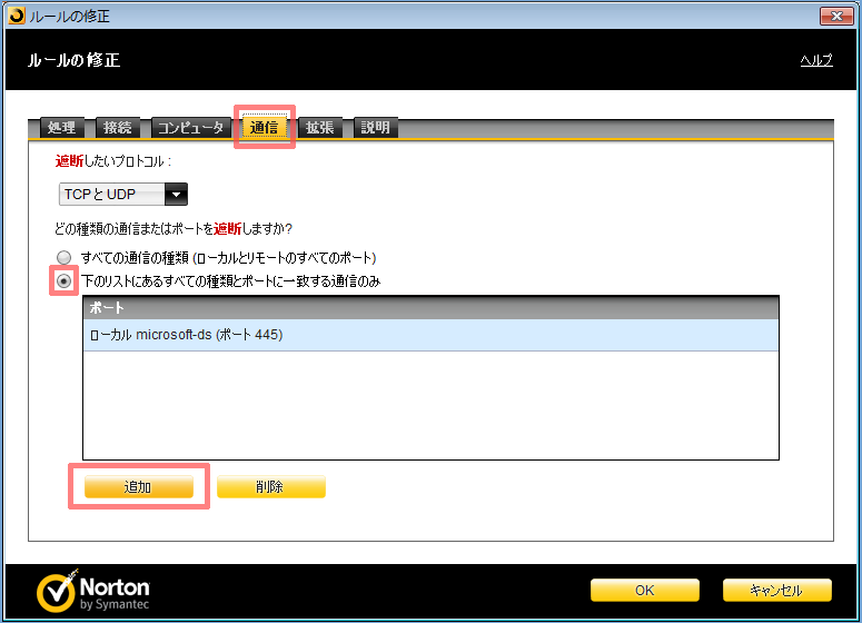 ![「下のリストにある全ての種類とポートに一致する通信のみ」にチェックを付け、[追加] をクリック](img/n360v5-10s.png)
