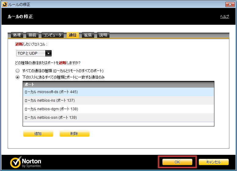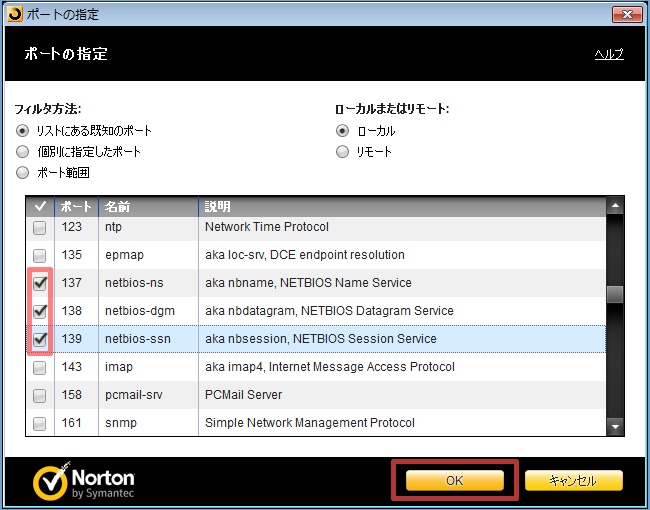 - ポートの一覧にある「137」「138」「139」にチェックを付けて、[OK] をクリックします。