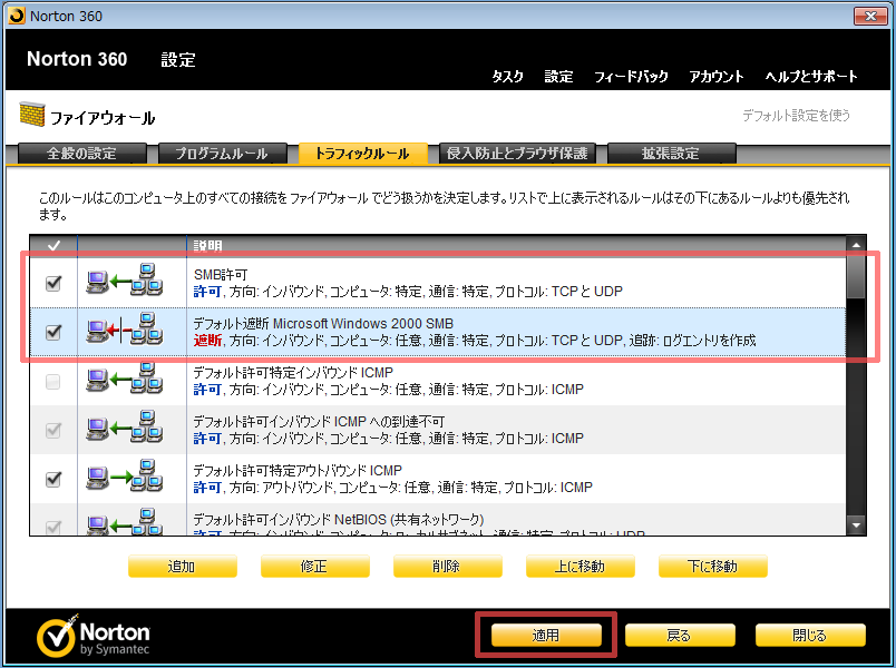 - 「SMB許可」と「デフォルト遮断 Microsoft Windows 2000 SMB」が下の画面のように1番目と2番目のルールになっていることを確認して、[適用] をクリックします。