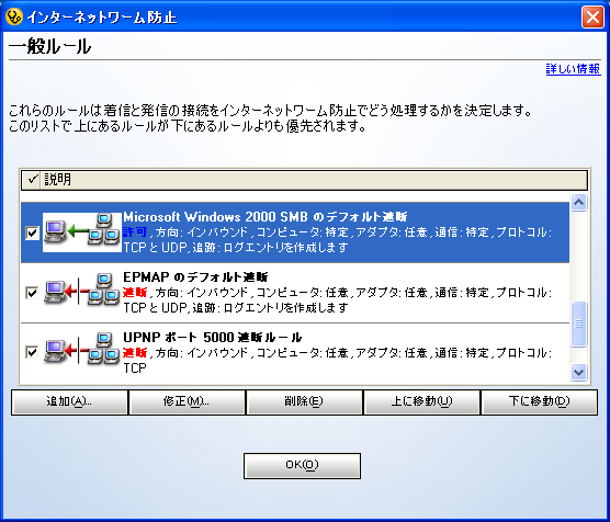 「Microsoft Windows 2000 SMB のデフォルト遮断」をクリックして青く反転させてから [修正] をクリックします。
