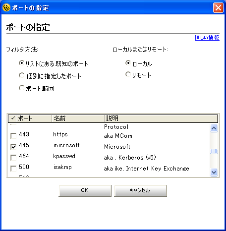 - 「リストにある既知のポート」にチェックが付いていることを確認し、下の欄から「445」の項目を探してチェックを付け、[OK] をクリックします。