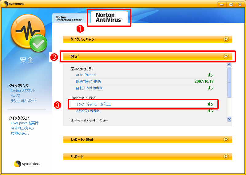- 「Norton」の画面が現れますので、[Norton AntiVirus] のタブをクリックします。続いて [設定]のバーをクリックし、「Webセキュリティ」の下にある [インターネットワーム防止] をクリックします。