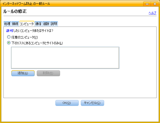 - 「ルールの修正」の画面が現れますので、[コンピュータ] のタブをクリックし、[下のリストにあるコンピュータとサイトのみ] にチェックを付けて [追加] をクリックします。