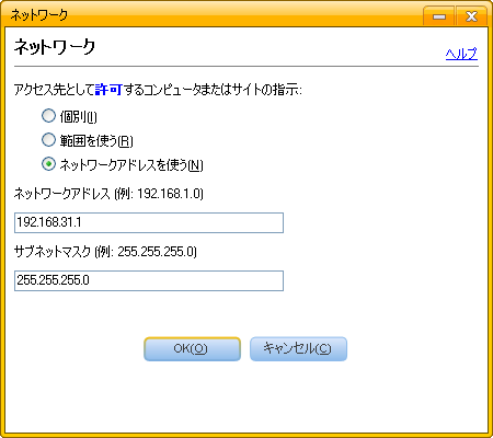 - 下の画面は、「ネットワークアドレス」に「192.168.31.1」を入力した例です。