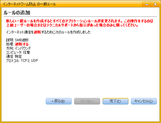 - ルールの名前を入力する画面が現れますので、たとえば「SMB遮断」と入力し、[次へ] をクリックします。