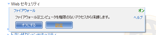 - 「Norton」の画面が現れますので、[Norton Internet Security] のタブをクリックします。続いて [設定] 、[Webセキュリティ]の各バーをクリックして、その中の [ファイアウォール] をクリックします。
