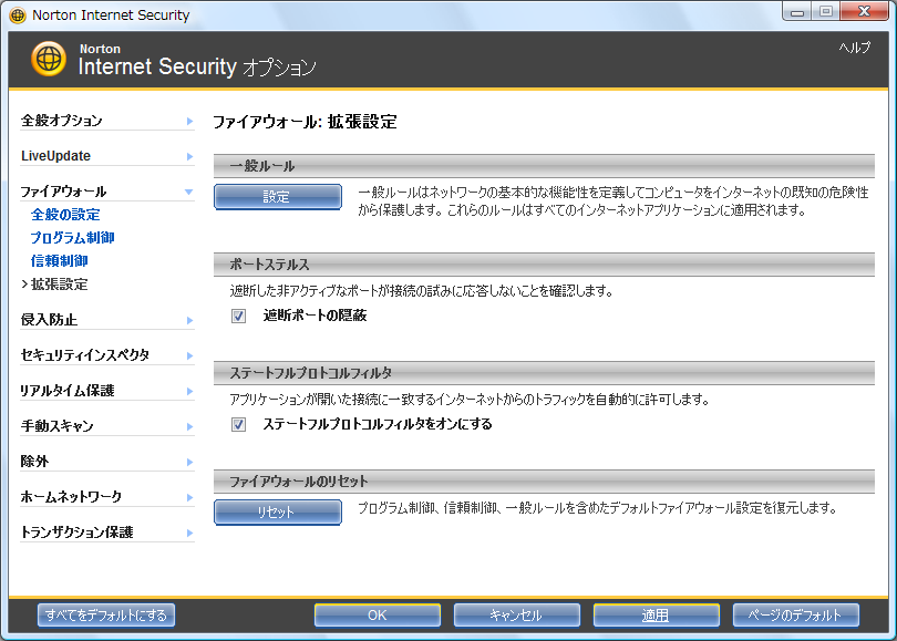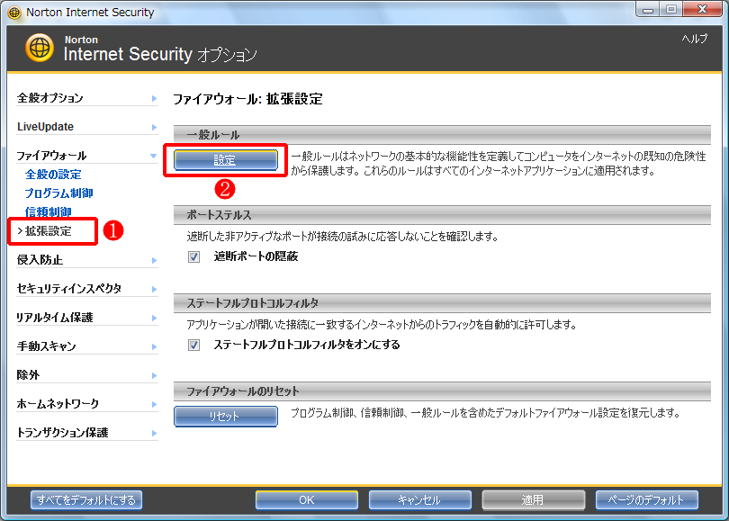 - 「Internet Security オプション」の画面が現れますので、左の [拡張設定] をクリックしてから、「一般ルール」の下の [設定] をクリックします。