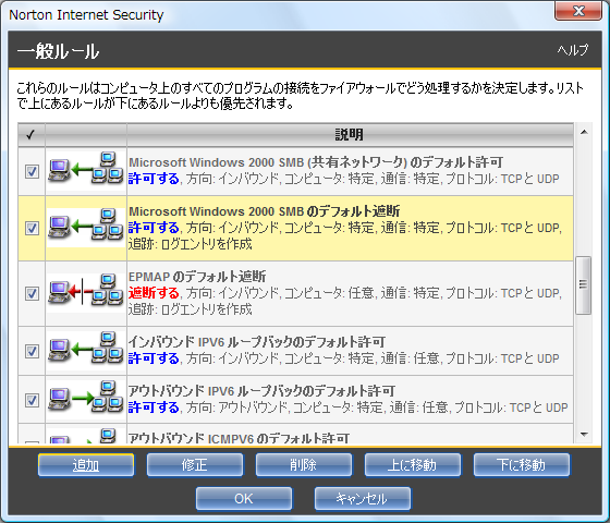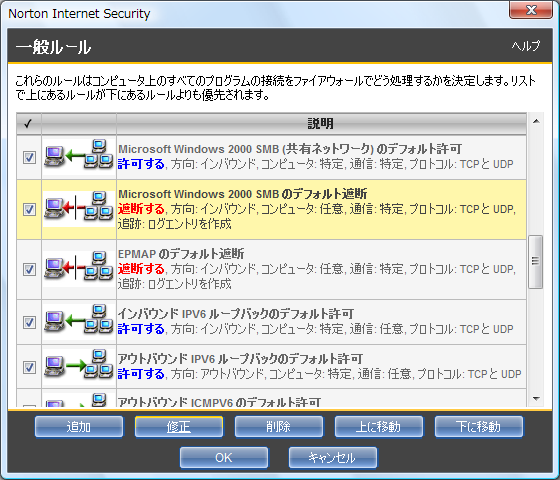 「Microsoft Windows 2000 SMB のデフォルト遮断」をクリックして反転させてから [修正] をクリックします。