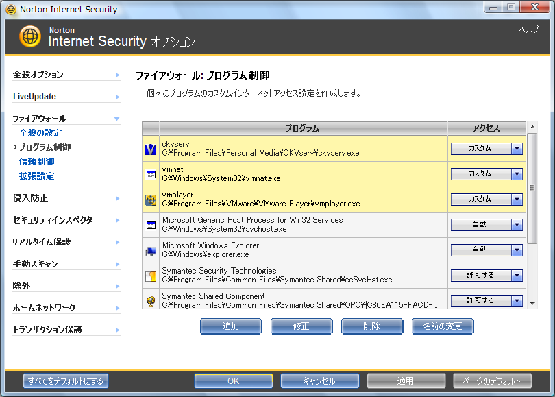 自動検出されますので、設定の必要はありません。自動検出されたプログラムは、「ファイアウォール:プログラム制御」の画面に自動で登録されます。