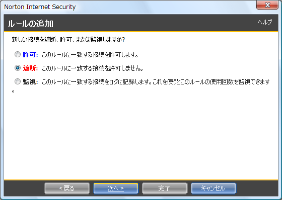 - 「ルールの追加」の画面が現れますので、[遮断] をクリックしてから [次へ] をクリックします。
