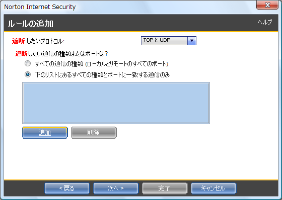 - 以下の画面に移りますので、「下のリストにあるすべての種類とポートに一致する通信のみ」をクリックしてから、[追加] をクリックします。