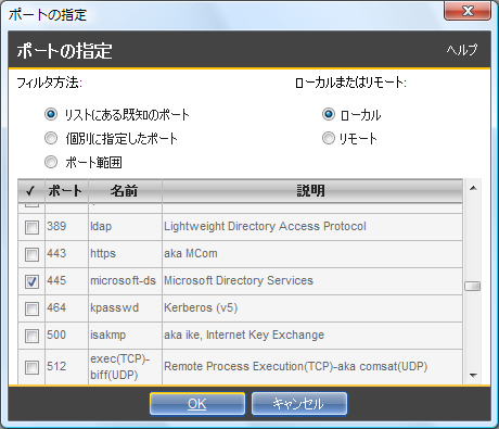 - 「ポートの指定」の画面が現れます。「リストにある既知のポート」にチェックが付いていることを確認し、下のポート一覧から「445」のポート番号を探してチェックを付けてから [OK] をクリックします。