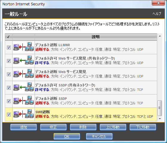 - 「一般ルール」の画面に戻ります。最後に「SMB遮断」のルールが追加されたのを確認してから、[OK] をクリックします。