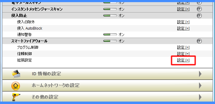 - 「スマートファイアウォール」の下にある「拡張設定」の [設定[+]] をクリックします。