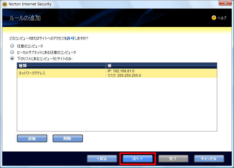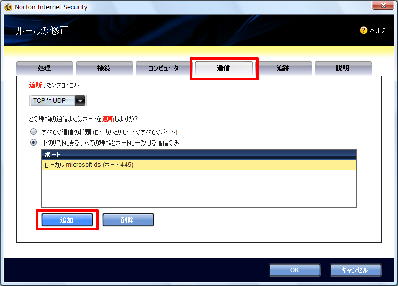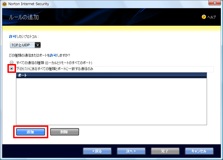 ![「下のリストにある全ての種類とポートに一致する通信のみ」にチェックを付け、[追加] をクリック](img/nis2009-10s.png)
