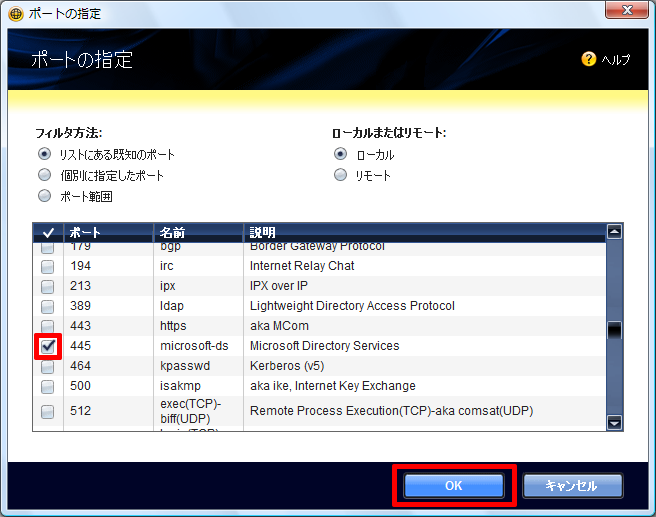 - ポートの一覧の中から「445」を探してチェックを付け、[OK] をクリックします。