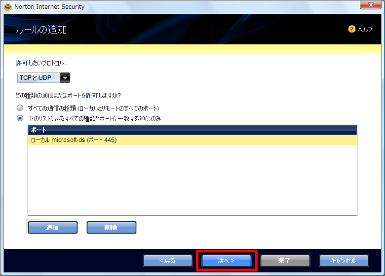 - リストに「ローカル microsoft-ds (ポート 445)」が追加されていることを確認して、[次へ] をクリックします。