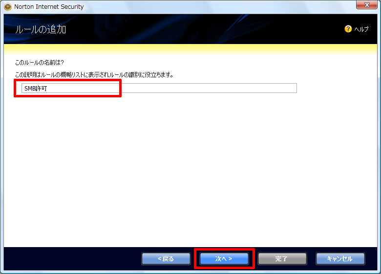 - 入力欄の文字列を「SMB許可」に書き換え、 [次へ] をクリックします。