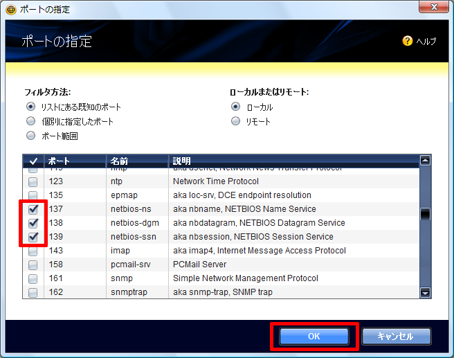 - ポートの一覧にある「137」「138」「139」にチェックを付けて [OK] をクリックします。