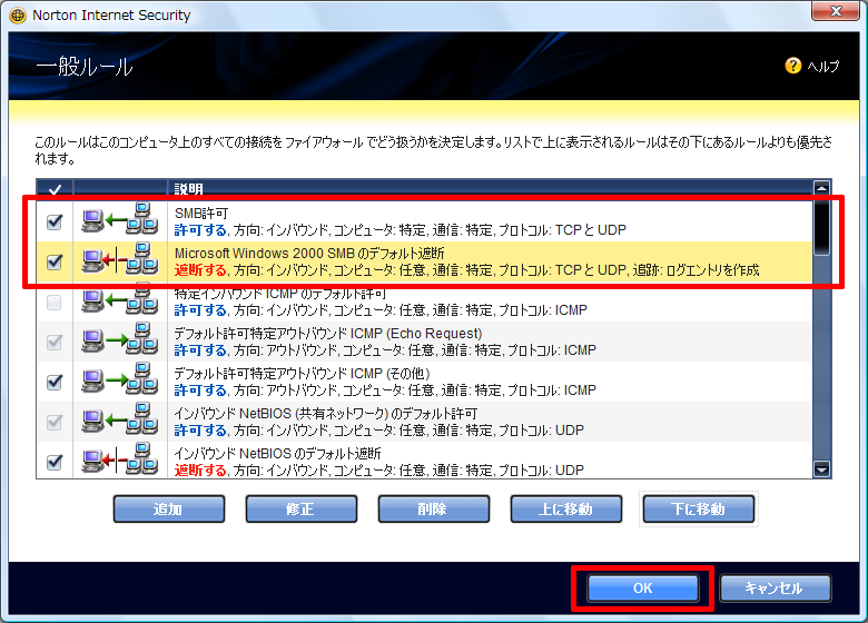 - 「SMB許可」と「Microsoft Windows 2000 SMBのデフォルト遮断」が下の画面のように1番目と2番目のルールになっていることを確認して、[OK] をクリックします。