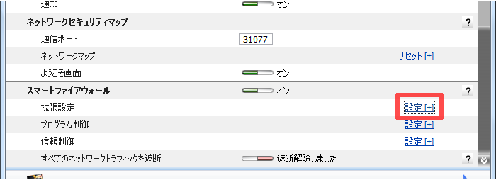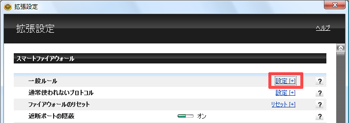 - 「スマートファイアウォール」の下にある「拡張設定」の [設定[+]] をクリックします。