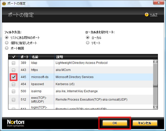 - ポートの一覧の中から「445」を探してチェックを付け、[OK] をクリックします。