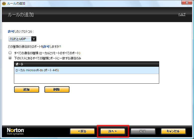 - リストに「ローカル microsoft-ds (ポート 445)」が追加されていることを確認して、[次へ] をクリックします。
