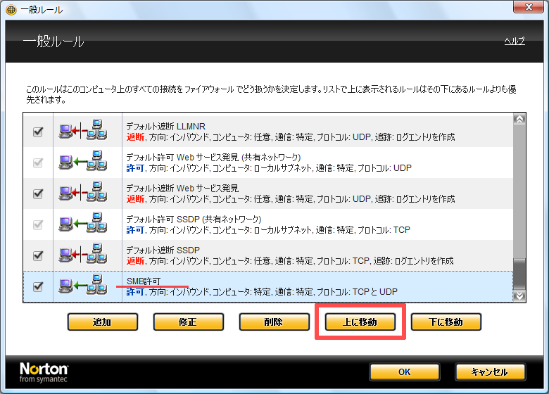 - 「SMB許可」のルールが一覧のいちばん下に追加されますので、[上に移動] を何回かクリックして一覧のいちばん上に移動させます。