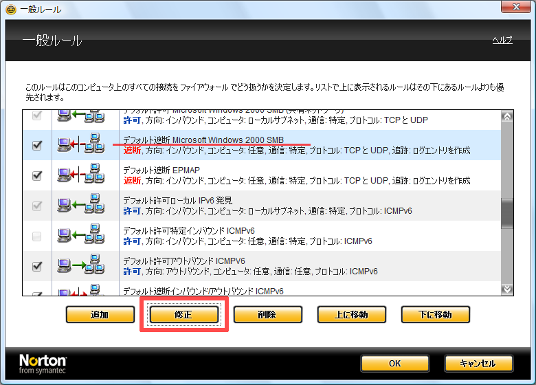「デフォルト遮断 Microsoft Windows 2000 SMB」をクリックして反転させてから、[修正] をクリックします。
