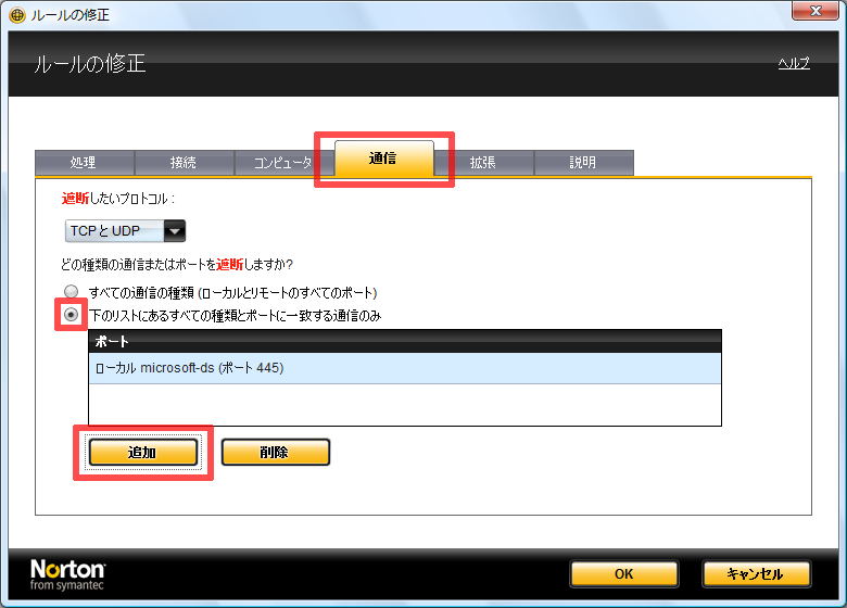 - 「通信」のタブをクリックし、「下のリストにあるすべての種類とポートに一致する通信のみ」にチェックが付いていることを確認してから、[追加] をクリックします。