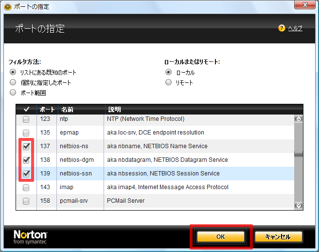 - ポートの一覧にある「137」「138」「139」にチェックを付けて、[OK] をクリックします。