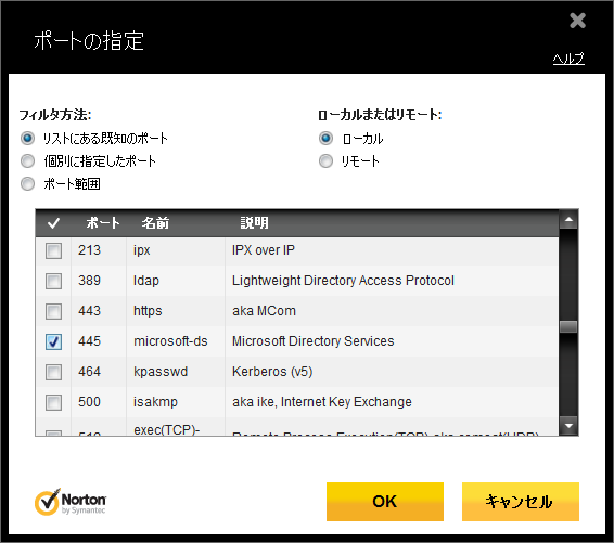 - ポートの一覧の中から「445」を探してチェックを付け、[OK] をクリックします。
