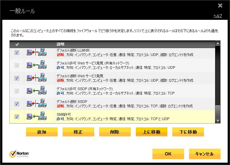 - 「SMB許可」のルールが一覧のいちばん下に追加されますので、[上に移動] を何回かクリックして一覧のいちばん上に移動させます。