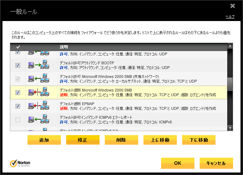 - 次に、ルールの一覧の中から「デフォルト遮断 Microsoft Windows 2000 SMB」を探し、クリックして反転させてから、[修正] をクリックします。