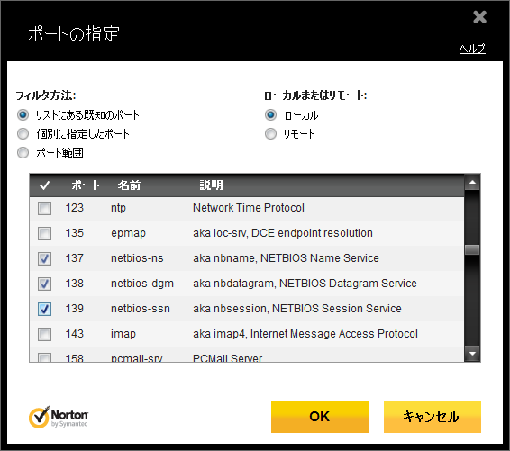 - ポートの一覧にある「137」「138」「139」にチェックを付けて、[OK] をクリックします。