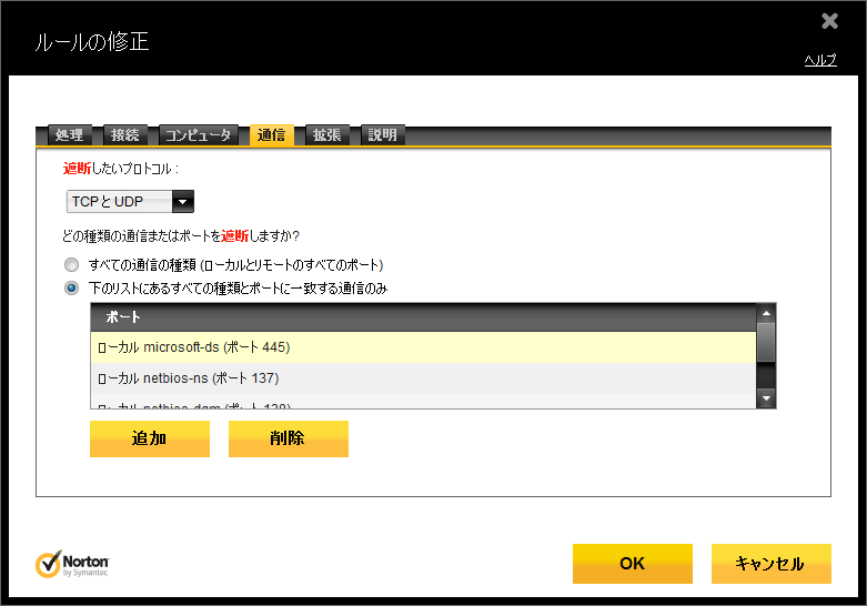 - 「通信」のタブをクリックし、「下のリストにあるすべての種類とポートに一致する通信のみ」にチェックが付いていることを確認してから、[追加] をクリックします。