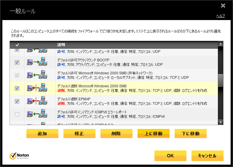 - 「デフォルト遮断 Microsoft Windows 2000 SMB」のルールを上から2番目のルールとするために、[上に移動] を何回かクリックします。