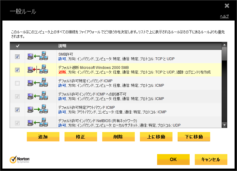 - 「SMB許可」と「デフォルト遮断 Microsoft Windows 2000 SMB」が下の画面のように1番目と2番目のルールになっていることを確認して、[OK] をクリックします。