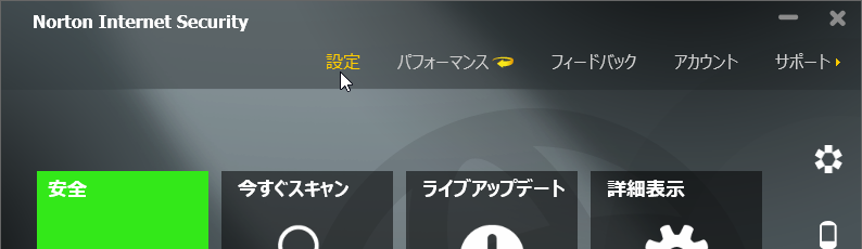 - 「Norton Internet Security」の画面が現れますので、上方中央にある[設定]をクリックします。
