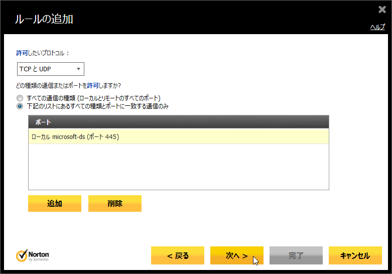 - リストに「ローカル microsoft-ds (ポート 445)」が追加されていることを確認して、[次へ]をクリックします。