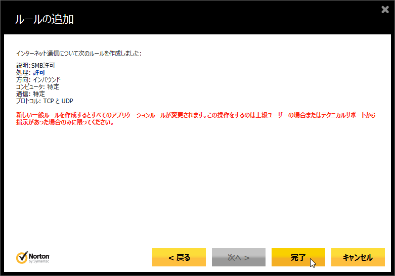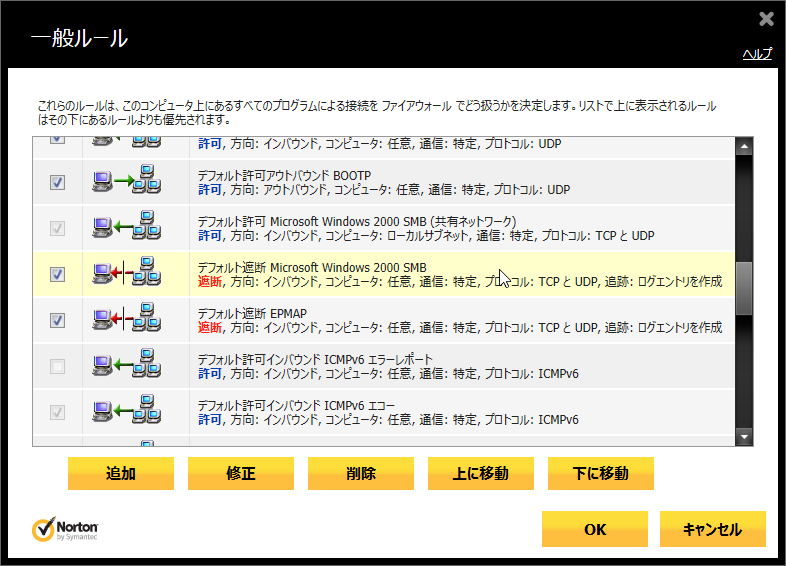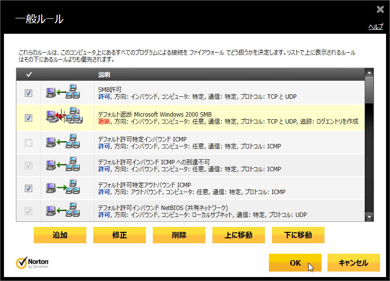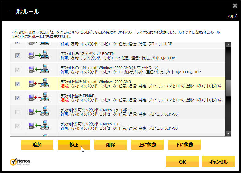 - 「SMB許可」と「デフォルト遮断 Microsoft Windows 2000 SMB」が下の画面のように1番目と2番目のルールになっていることを確認します。