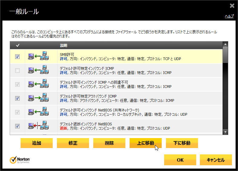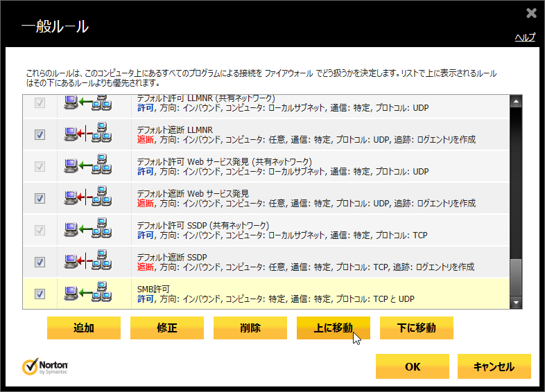 - [上に移動]を何回かクリックし、「SMB許可」のルールを一覧のいちばん上に移動させます。