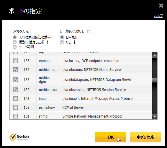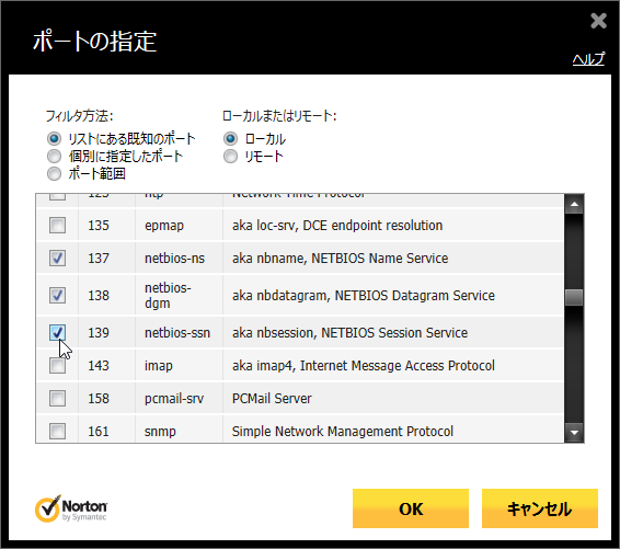 - ポートの一覧にある「137」、「138」、「139」にチェックを付けます。