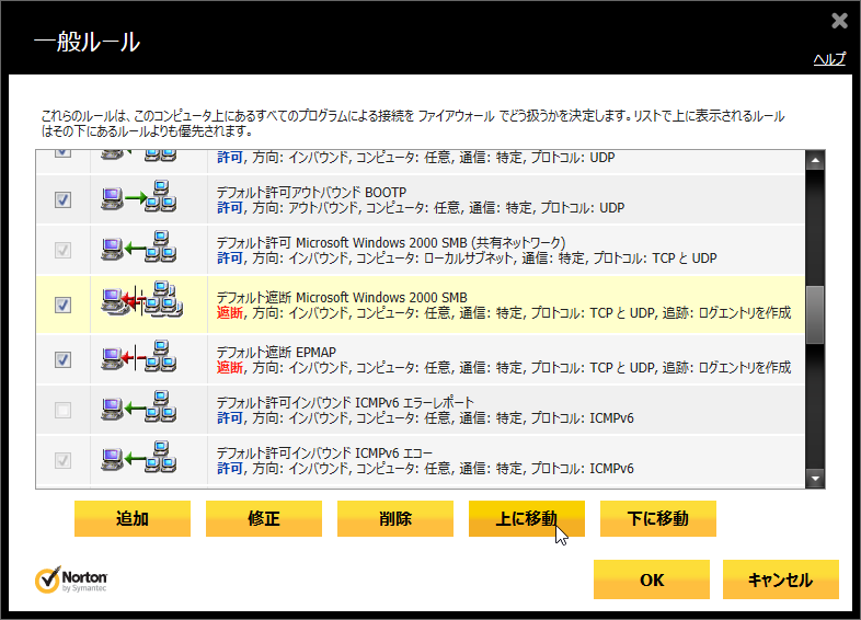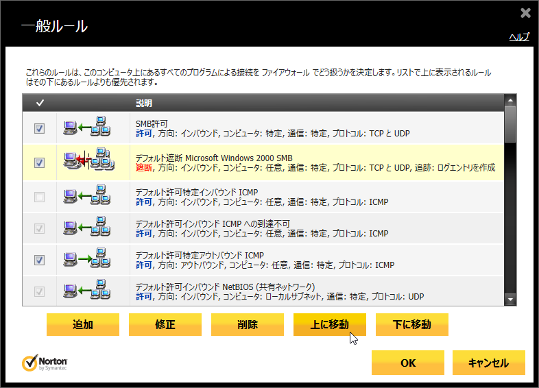 - 「デフォルト遮断 Microsoft Windows 2000 SMB」のルールを上から2番目のルールとするために、[上に移動]を何回かクリックします。