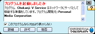 「超漢字Vサービス」のインストール直後などに、以下のメッセージが現れた場合、 [許可] をクリックします。この操作により Windows 接続のプリンタが利用できるようになります。