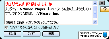 超漢字Vの初回起動時や超漢字の基本ブラウザを起動したときなどに、以下のような VMware に関するメッセージが現れた場合、 [許可] をクリックします。