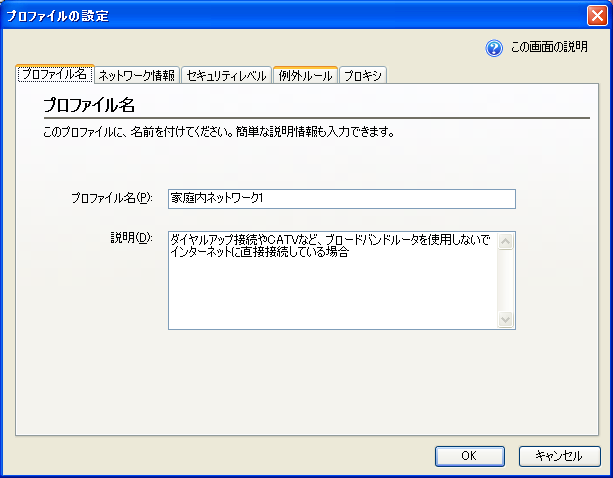 利用しているプロファイルが、「家庭内ネットワーク1」、「家庭内ネットワーク2」、「社内ネットワーク」の場合は、標準の設定のままで利用できます。設定の必要はありません。