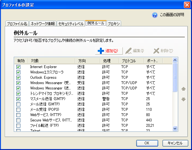 - 「例外ルール」の画面が現れますので、[追加] をクリックします。