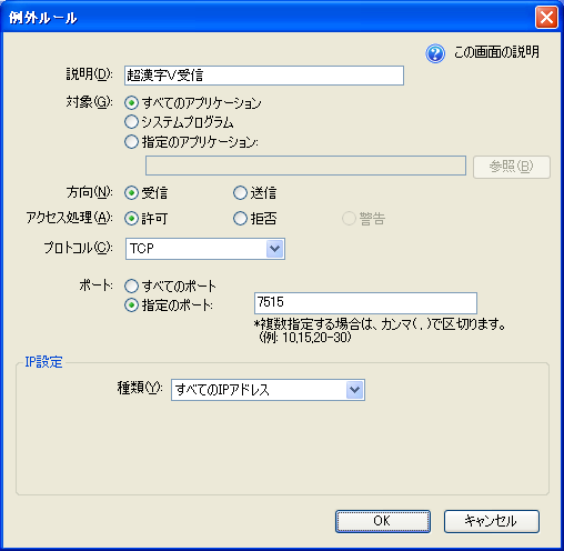 - 以下の画面と同じになるように例外ルールを設定し、最後に [OK] をクリックします。