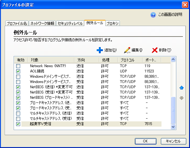 - 例外ルールの一覧画面で、以下のように「超漢字V受信」のルールが最後に追加されていることを確認します。そして [OK] をクリックします。